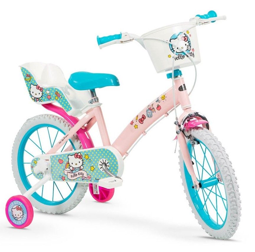 bicicleta fetite toimsa hello kitty 16 inch, cu roti ajutatoare si cosulet, de la 5 ani, inaltimea recomandata 110-120 cm, cos frontal si scaun pentru papusa, frana de mana pe ambele roti