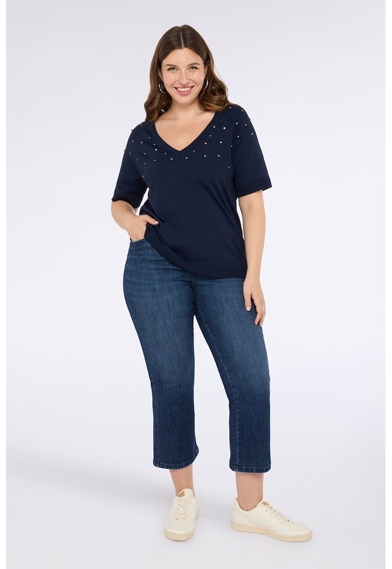 Caracteristici Culoare: indigo Imprimeu: uni Croiala: kick flared Material: denim Talie: inalta Lungime: trei sferturi Buzunare: 5 Sistem inchidere: fermoar - nasturi Detalii: acest produs se adreseaza femeilor cu forme pline (plus size). Compozitie Exterior: 76% bumbac - 21% poliester - 3% elastan