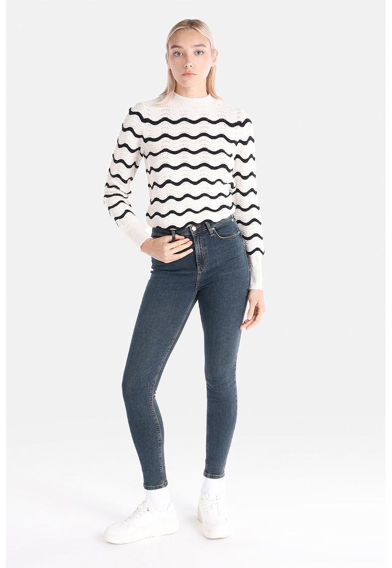 Caracteristici Culoare: albastru prafuit Imprimeu: uni Croiala: skinny Material: denim Talie: inalta Lungime: crop Buzunare: 5 Compozitie Exterior: 98% bumbac - 2% elastan