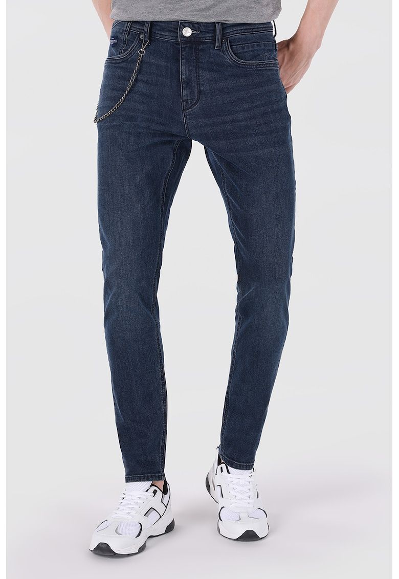 Caracteristici Culoare: bleumarin Material: denim Imprimeu: uni Croiala: slim fit Talie: medie Lungime: lungi Buzunare: 5 Detalii: detaliu din lant Sistem inchidere: nasturi Compozitie Exterior: 99% bumbac - 1% elastan
