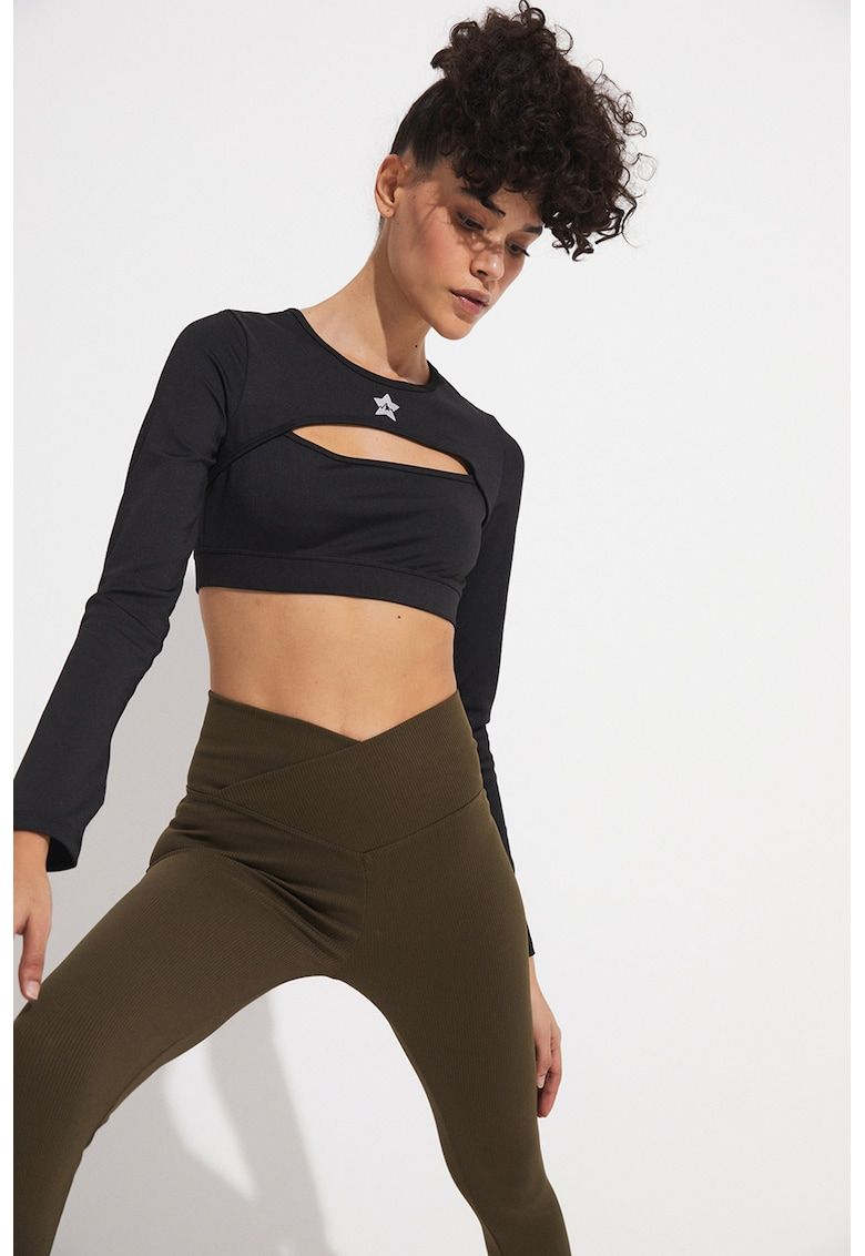 Caracteristici Culoare: negru Imprimeu: uni Stil: casual Croiala: crop Sistem inchidere: fara inchidere Material: poliester - elastan Decolteu: la baza gatului Lungime maneca: maneca lunga Detalii: decupaj pe partea din fata Compozitie Exterior: 82% poliester - 18% elastan