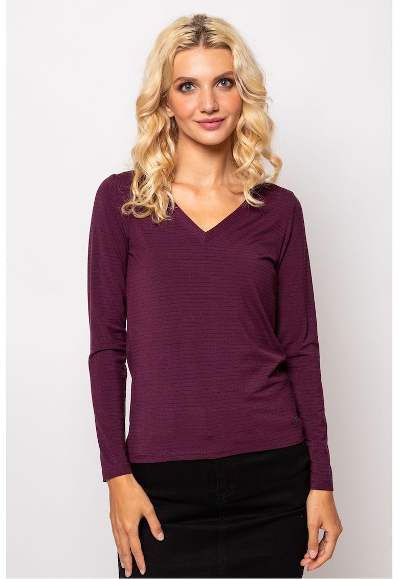 Caracteristici Culoare: violet Imprimeu: uni Stil: casual Croiala: regular fit Sistem inchidere: fara inchidere Material: viscoza Decolteu: in v Lungime maneca: maneca lunga Compozitie Exterior: 85% viscoza - 8% elastan - 5% nailon - 2% lurex