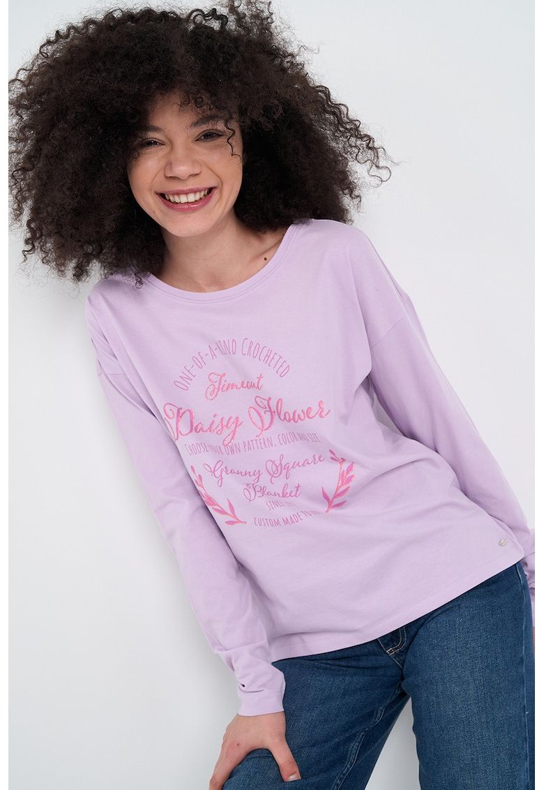 Caracteristici Culoare: lila Imprimeu: text Stil: casual Croiala: regular fit Material: bumbac Decolteu: rotund Lungime maneca: maneca lunga Compozitie Exterior: 100% bumbac