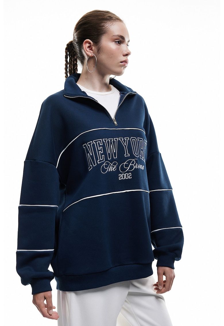 Caracteristici Tip produs: bluza de trening Culoare: bleumarin Imprimeu: text Croiala: lejer Sistem inchidere: fermoar Material: sintetic - bumbac - viscoza Lungime maneca: maneca lunga Compozitie Exterior: 58% bumbac - 36% poliester - 6% viscoza