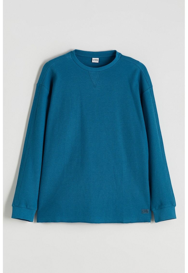 Caracteristici Culoare: albastru petrol Stil: casual Imprimeu: uni Material: poliester - bumbac Croiala: lejer Decolteu: rotund Lungime maneca: maneca lunga Compozitie Exterior: 80% bumbac - 20% poliester