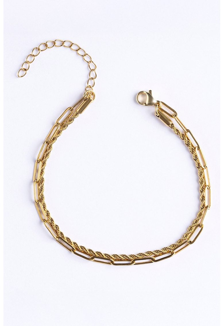 Caracteristici Tip produs: bratara Material: inox Culoare: auriu Detalii: aspect 2in1 - a se evita contactul cu alcool - parfum - acetona - detergent - suprafete abrazive - lovirea - zgarierea acestora Sistem inchidere: lobster Ambalaj: produsul se livreaza in ambalaj personalizat. Compozitie Compozitie: otel inoxidabil Pietre: fara pietre Placaj: aur de 18k Dimensiuni Lungime: 22 cm