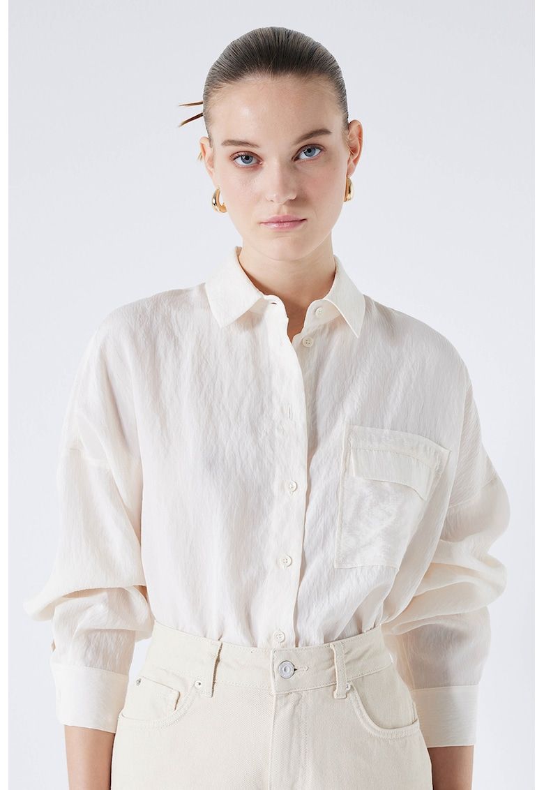 Caracteristici Culoare: alb fildes Imprimeu: uni Stil: casual Material: viscoza Croiala: regular fit Guler: ascutit Lungime maneca: maneca lunga Buzunare: 1 buzunar pe piept Sistem inchidere: nasturi Compozitie Exterior: 81% viscoza - 19% poliamida