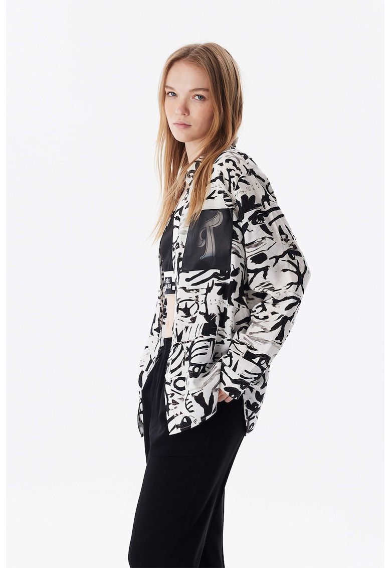 Caracteristici Culoare: negru - alb murdar Imprimeu: grafic Stil: casual Material: viscoza - elastan Croiala: regular fit Guler: ascutit Lungime maneca: maneca lunga Buzunare: pe piept Sistem inchidere: nasturi Compozitie Exterior: 80% viscoza - 20% elastan