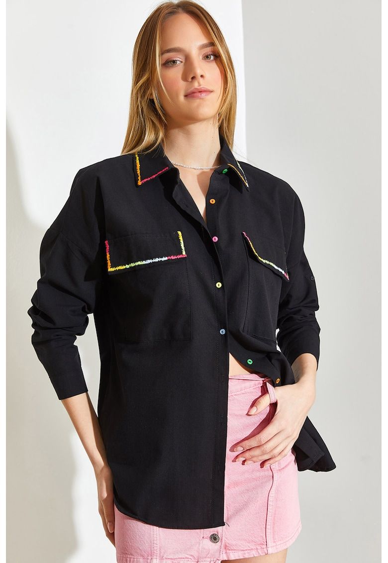 Caracteristici Culoare: negru Imprimeu: uni Stil: casual Material: bumbac Croiala: lejer Guler: ascutit Lungime maneca: maneca lunga Buzunare: 2 Sistem inchidere: nasturi Compozitie Exterior: 100% bumbac