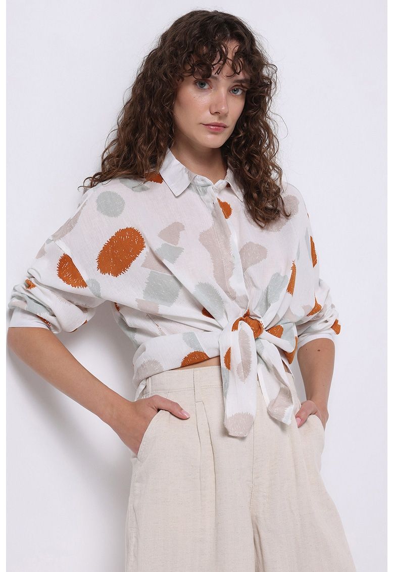 Caracteristici Culoare: multicolor Imprimeu: abstract Stil: casual Material: bumbac Croiala: lejer Guler: clasic Tip maneca: cazuta Lungime maneca: maneca lunga Sistem inchidere: nasturi Compozitie Exterior: 100% bumbac