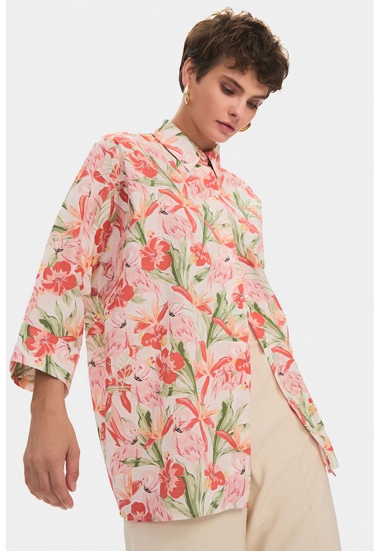 Caracteristici Culoare: roz deschis - crem Imprimeu: floral Stil: casual Material: bumbac Croiala: supradimensionat Guler: ascutit Lungime maneca: maneca lunga Sistem inchidere: nasturi Compozitie Exterior: 100% bumbac