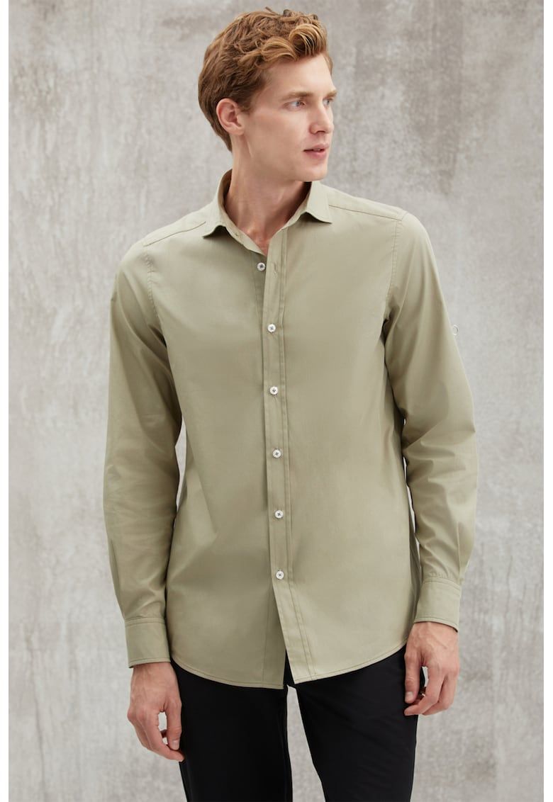 Caracteristici Culoare: verde fistic Material: bumbac Imprimeu: uni Stil: elegant Croiala: regular fit Lungime maneca: maneca lunga Sistem inchidere: nasturi Compozitie Exterior: 100% bumbac