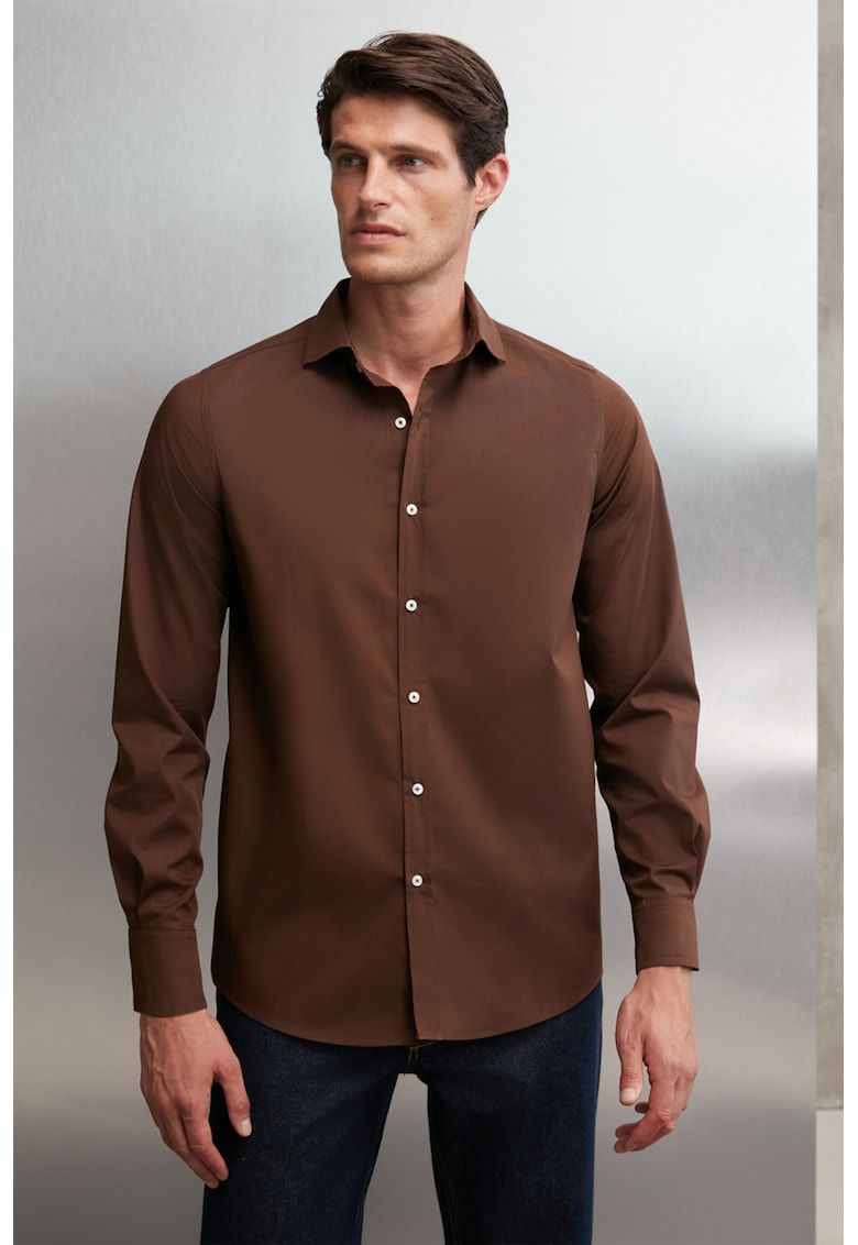 Caracteristici Culoare: maro Material: bumbac Imprimeu: uni Stil: elegant Croiala: regular fit Guler: clasic Lungime maneca: maneca lunga Sistem inchidere: nasturi Compozitie Exterior: 100% bumbac