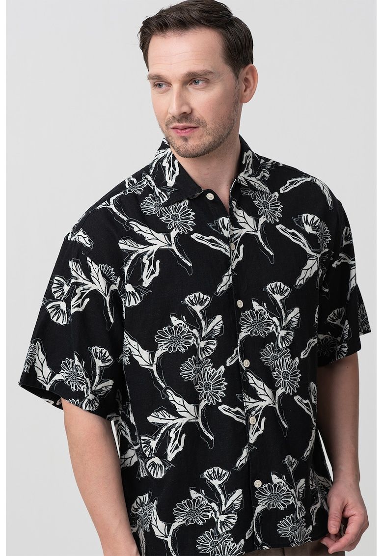 Caracteristici Culoare: alb fildes - negru stins Material: viscoza - in Imprimeu: floral Stil: casual Croiala: regular fit Guler: ascutit Lungime maneca: maneca scurta Sistem inchidere: nasturi Compozitie Exterior: 55% in - 45% viscoza Info model Modelul poarta un produs de marimea M. Marimi model: 188 cm inaltime - 101 cm bust - 83 cm talie - 102 cm sold