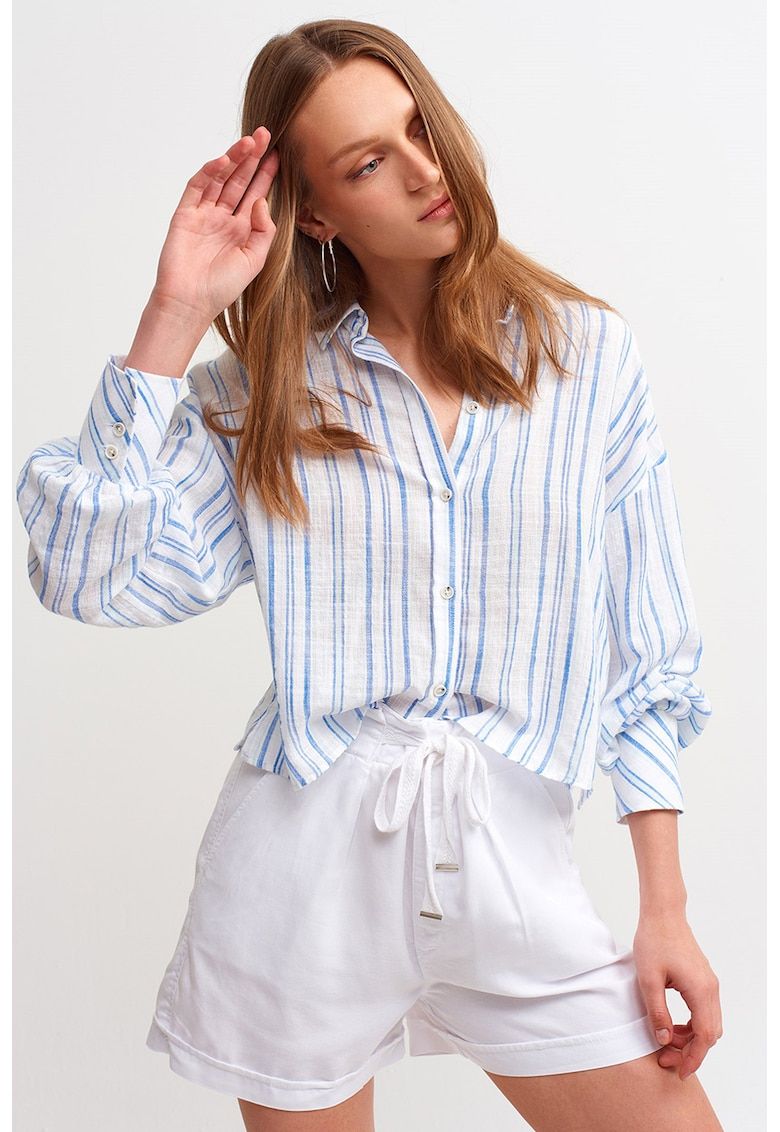 Caracteristici Culoare: alb murdar - albastru Imprimeu: dungi Stil: casual Material: bumbac Croiala: lejer Guler: clasic Lungime maneca: maneca lunga Sistem inchidere: nasturi Compozitie Exterior: 99% bumbac - 1 elastan