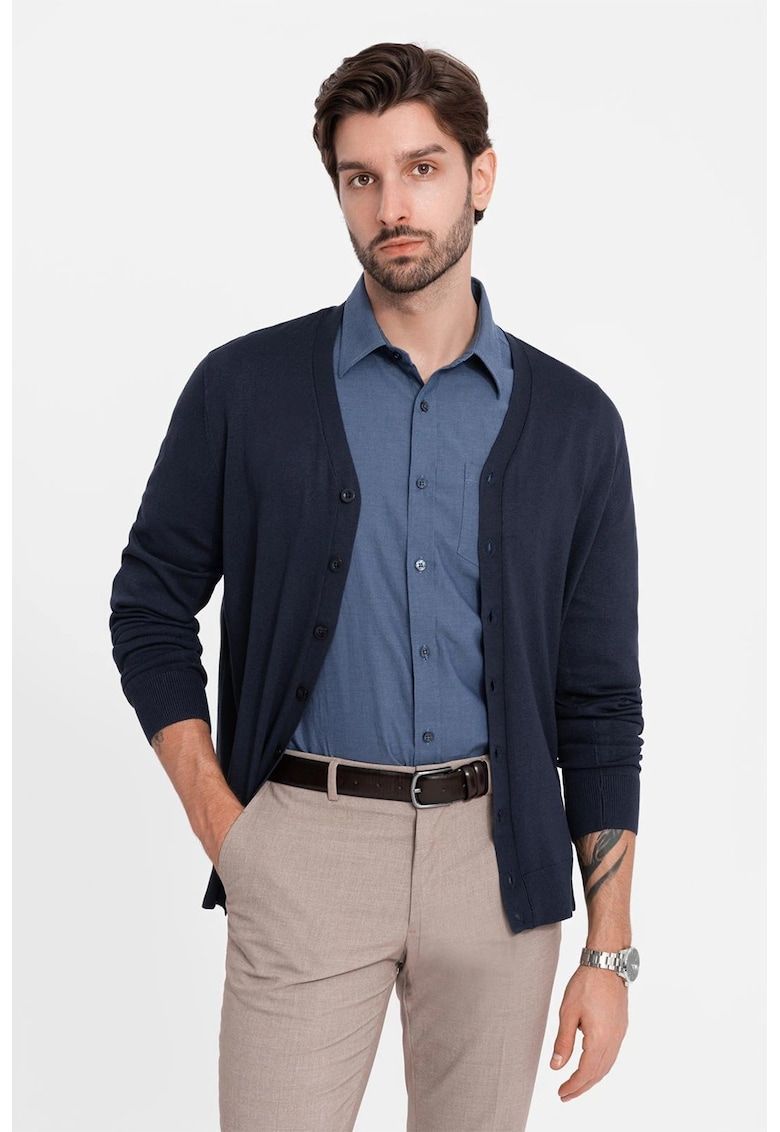 Caracteristici Culoare: albastru inchis Material: bumbac Imprimeu: uni Stil: elegant Croiala: regular fit Guler: ascutit Lungime maneca: maneca lunga Buzunare: unul aplicat pe piept Sistem inchidere: nasturi Compozitie Exterior: 100% bumbac