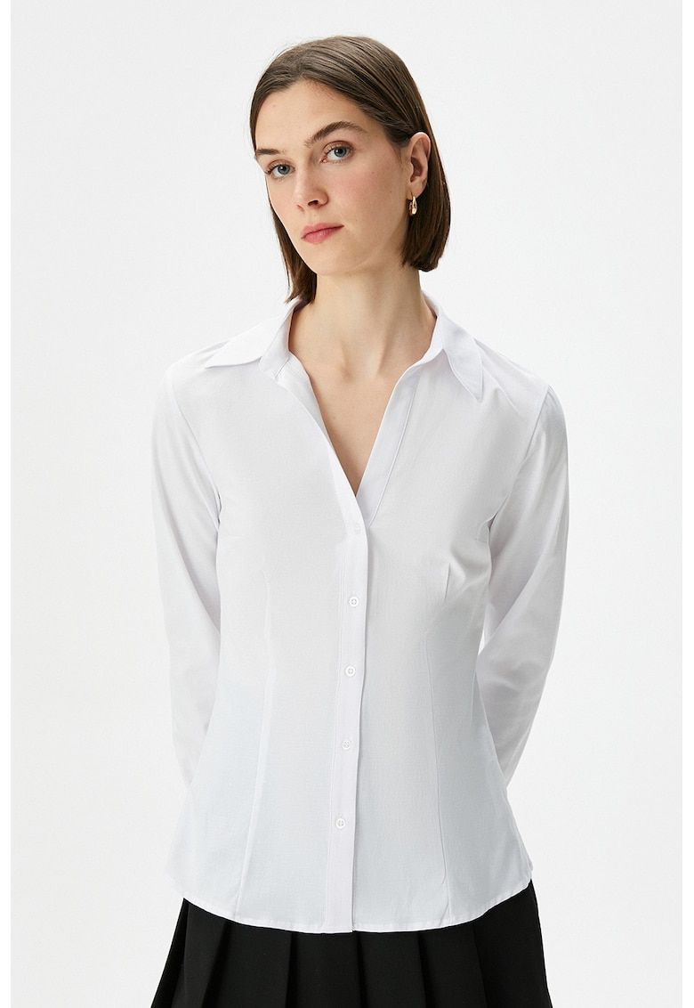 Caracteristici Culoare: alb Imprimeu: uni Stil: casual Material: poliester - bumbac Croiala: slim fit Guler: clasic Lungime maneca: maneca lunga Sistem inchidere: nasturi Compozitie Exterior: 50% bumbac - 47% poliester - 3% elastan