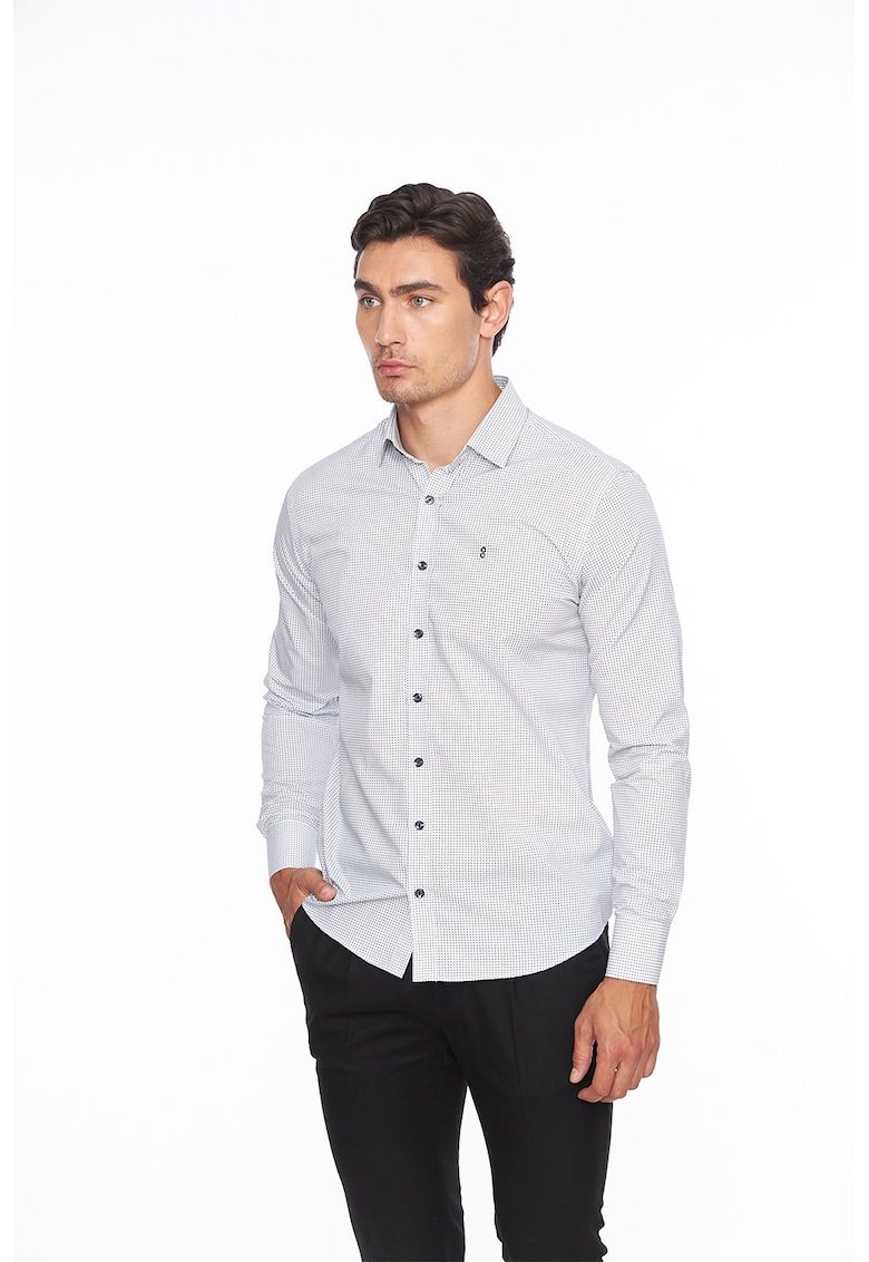 Caracteristici Culoare: alb - albastru Material: poliester - bumbac Imprimeu: buline Stil: elegant Croiala: slim fit Guler: clasic Maneci: cu mansete cu nasturi Lungime maneca: maneca lunga Sistem inchidere: nasturi Compozitie Exterior: 80% bumbac - 20% poliester Info model Modelul poarta un produs de marimea M. Marimi model: 184 cm inaltime - 104 cm bust - 84 cm talie - 103 cm sold