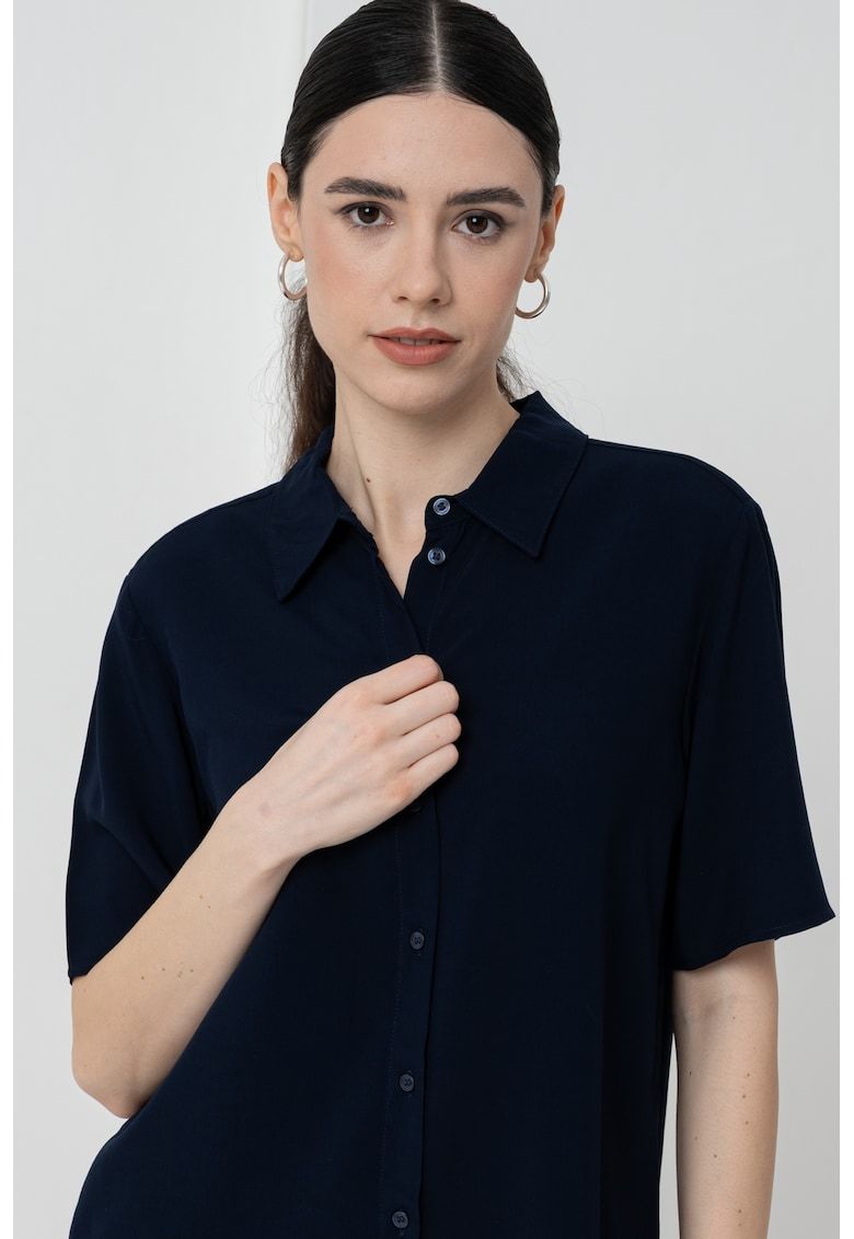 Caracteristici Culoare: bleumarin Imprimeu: uni Stil: elegant Material: viscoza Croiala: regular fit Guler: ascutit Lungime maneca: maneca scurta Sistem inchidere: nasturi Compozitie Exterior: 100% viscoza Info model Modelul poarta un produs de marimea S. Marimi model: 177 cm inaltime - 86 cm bust - 60 cm talie - 90 cm sold