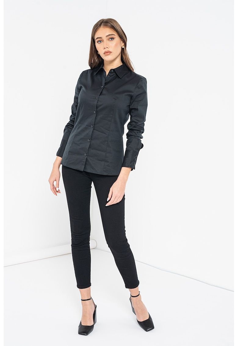 Caracteristici Culoare: negru Imprimeu: uni Stil: casual Material: bumbac - poliamida Croiala: slim fit Guler: clasic Lungime maneca: maneca lunga Sistem inchidere: nasturi Compozitie Exterior: 70% bumbac - 27% poliamida - 3% elastan Info model Modelul poarta un produs de marimea S/36 EU. Marimi model: 173 cm inaltime - 87 cm bust - 63 cm talie - 92 cm sold