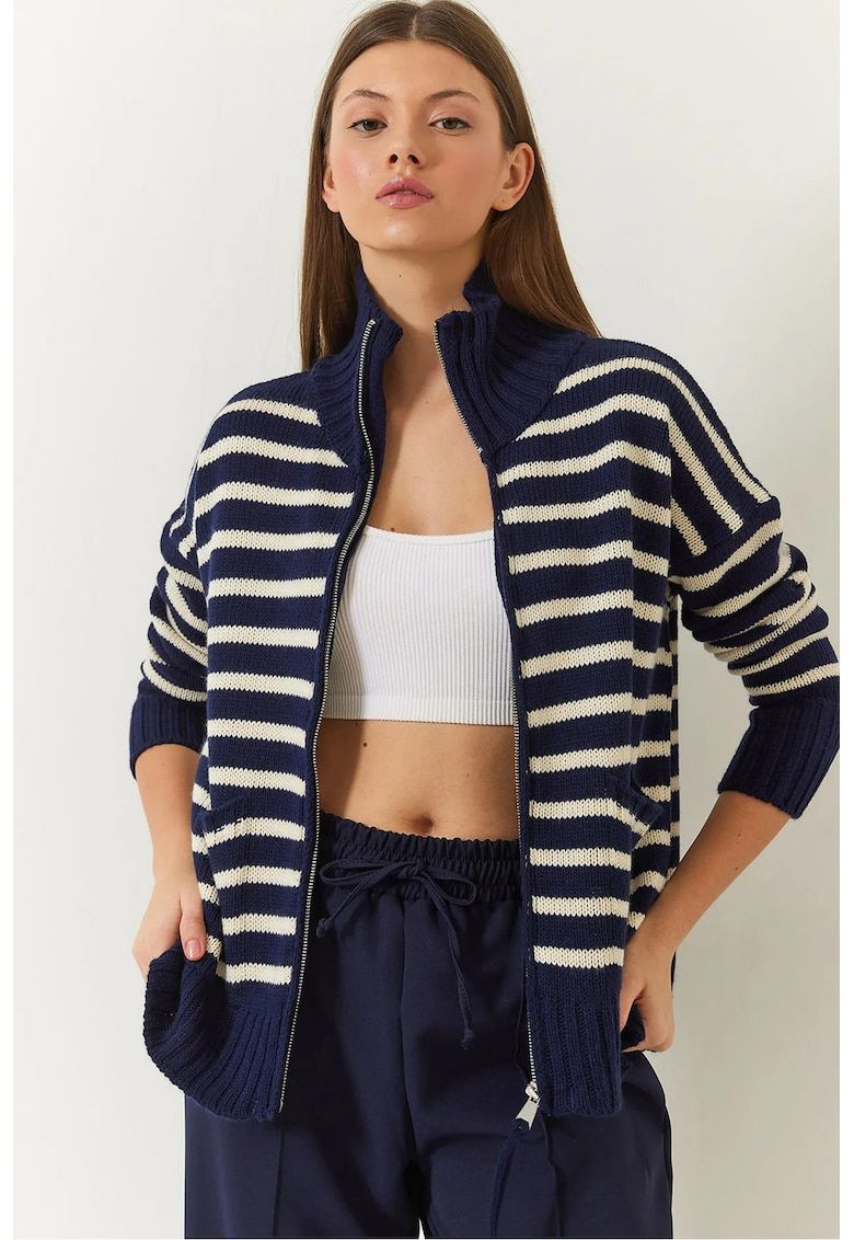 cardigan tricotat cu dungi - cu fermoar - albastru - material acrilic -
