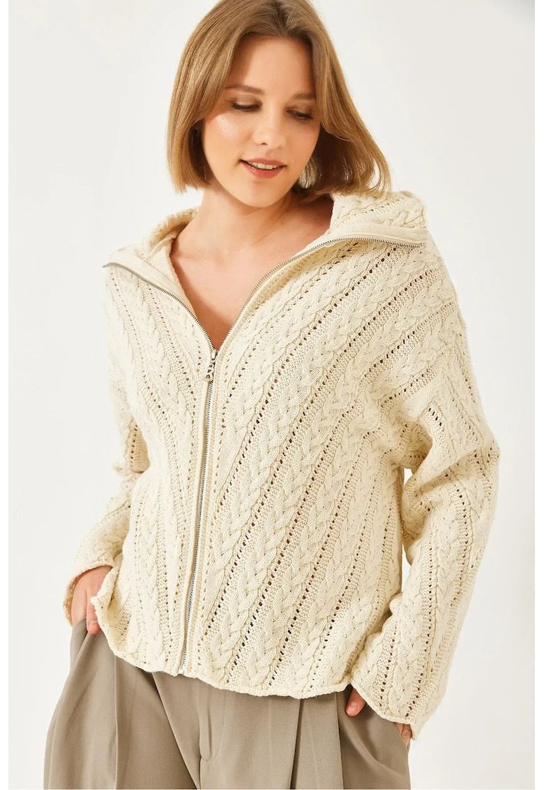 cardigan tricotat cu guler cu fermoar - texturat - bej - material acril -