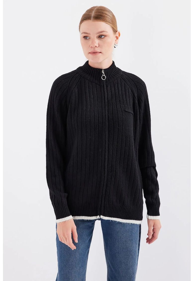 cardigan tricotat cu nervuri - guler cu fermoar - lana/acril/poliester - negru