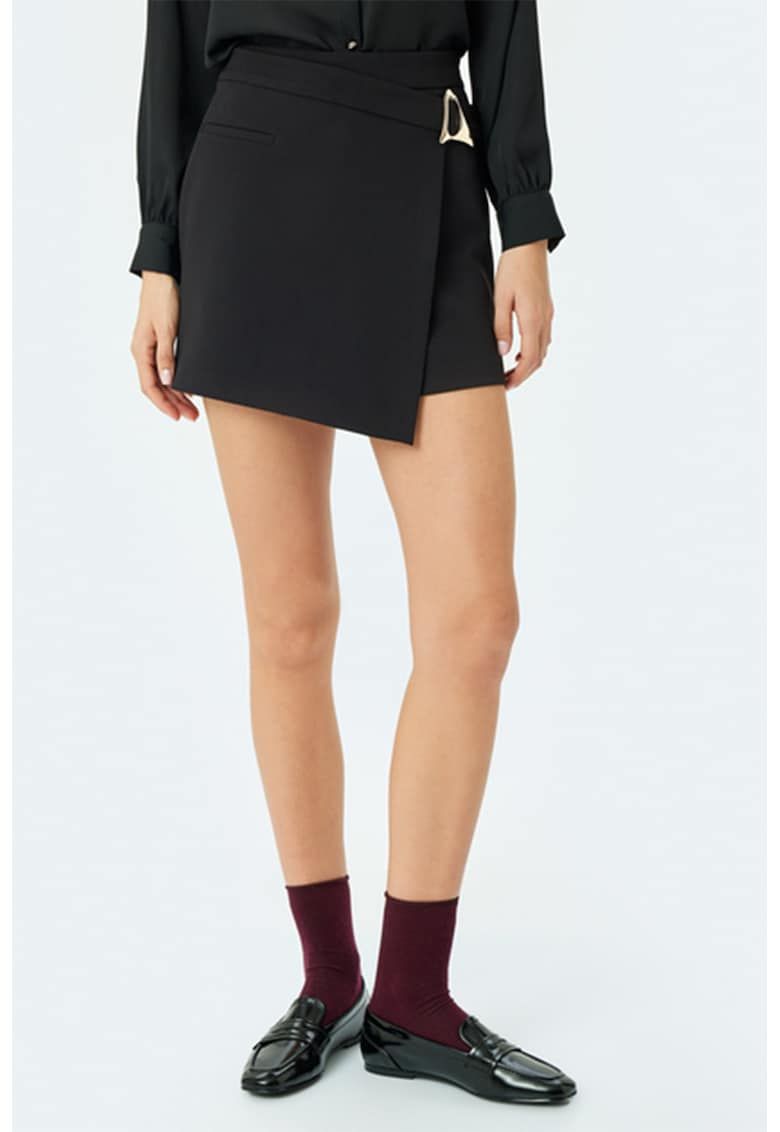 Caracteristici Culoare: negru Stil: casual Material: poliester - elastan Imprimeu: uni Croiala: dreapta Lungime: scurti Talie: medie Detalii: terminatie asimetrica Sistem inchidere: fara inchidere Compozitie Exterior: exterior: 86% poliester - 14% elastan