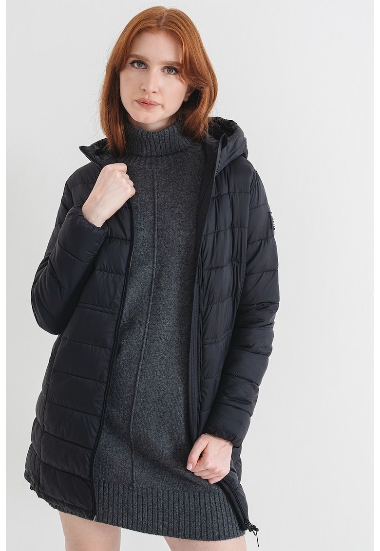Caracteristici Tip produs: geaca Culoare: negru Imprimeu: uni Material: sintetic Croiala: regular fit Gluga: cu gluga Lungime maneca: maneca lunga Buzunare: 3 interioare Sistem inchidere: fermoar Compozitie Exterior: 100% poliamida Info model Modelul poarta un produs de marimea S. Marimi model: 177 cm inaltime - 82 cm bust - 66 cm talie - 91 cm sold