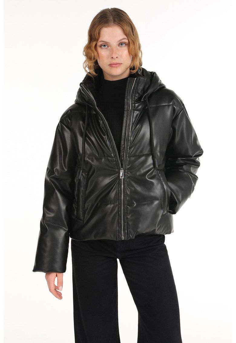 Caracteristici Tip produs: geaca Culoare: negru Imprimeu: uni Material: piele ecologica Croiala: regular fit Guler: inalt Gluga: cu gluga Lungime maneca: maneca lunga Buzunare: cu fermoar Detalii: design matlasat Sistem inchidere: fermoar Compozitie Exterior: 100% poliester - pelicula: 100% poliuretan Captuseala: 100% poliester Umplutura: 100% poliester