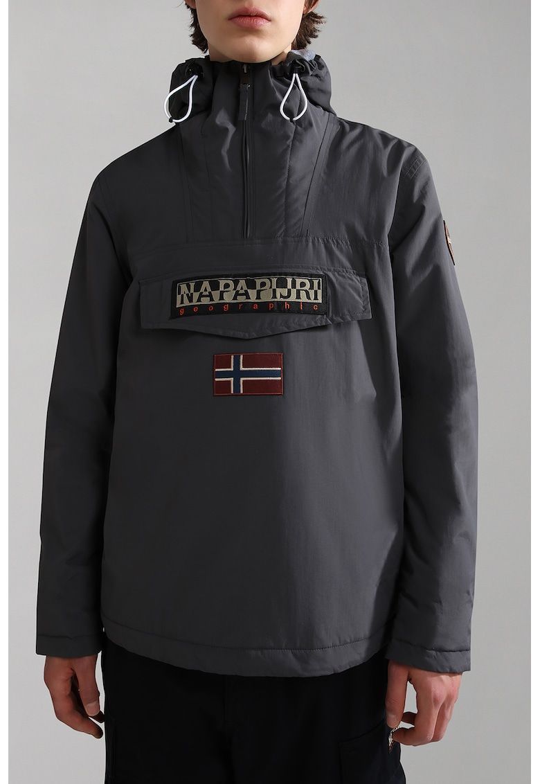 Caracteristici Tip produs: geaca Culoare: gri inchis Material: poliamida Croiala: regular fit Imprimeu: logo Gluga: cu gluga Lungime maneca: maneca lunga Buzunare: unul pe piept Detalii: logo brodat - gluga cu snur pentru ajustare - slituri laterale cu fermoar - fenta cu fermoar - interior din fleece Sistem inchidere: fara inchidere Compozitie Exterior: 100% poliamida