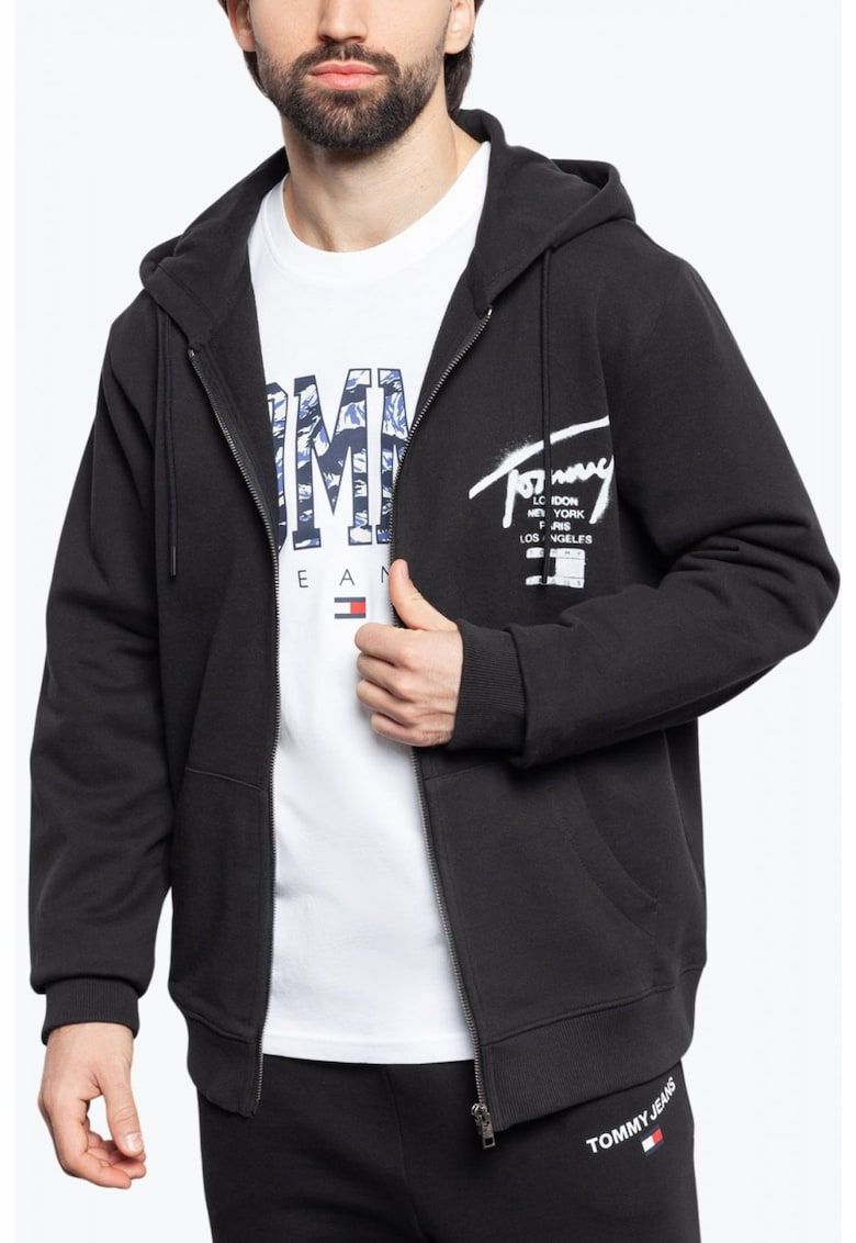 hanorac barbati cu fermoar si imprimeu cu logo spray print din bumbac negru