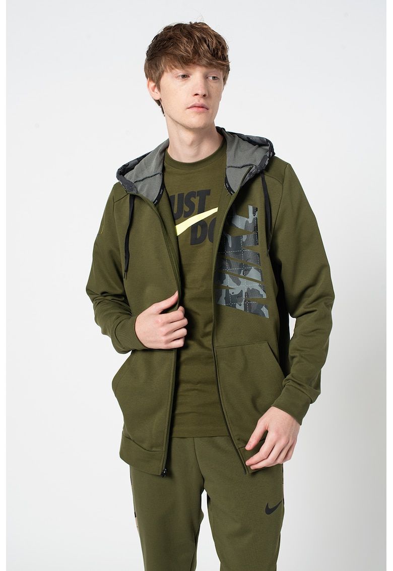 Caracteristici generale Culoare: gri - kaki Imprimeu: cu model Sport: fitness Lungime maneca: maneca lunga Croiala: regular fit Sistem inchidere: fermoar Material: poliester - bumbac - sustenabil Tehnologie material: dri fit Detalii: logo - gluga cu snur pentru ajustare - 2 buzunare oblice Detalii material Exterior: 61% bumbac - 39% poliester Info model Modelul poarta un produs de marimea M. Marimi model: 188 cm inaltime - 90 cm bust - 86 cm talie - 83 cm sold