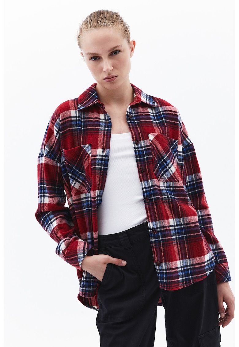 jacheta-camasa supradimensionata in carouri cu buzunare pe piept