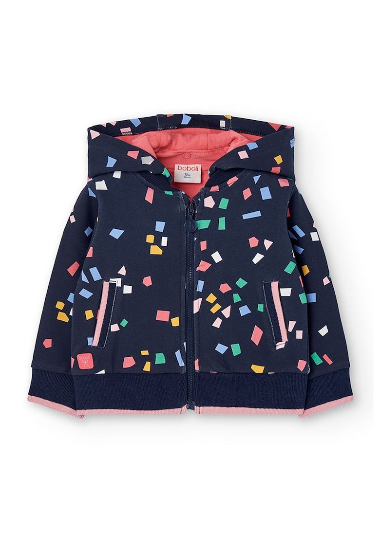 Caracteristici Tip produs: jacheta Culoare: verde - roz - bleumarin Imprimeu: geometric Material: bumbac Lungime: scurta Lungime maneca: maneca lunga Detalii: cu gluga Sistem inchidere: fermoar Compozitie Exterior: 95% bumbac - 5% elastan Captuseala: 100% bumbac