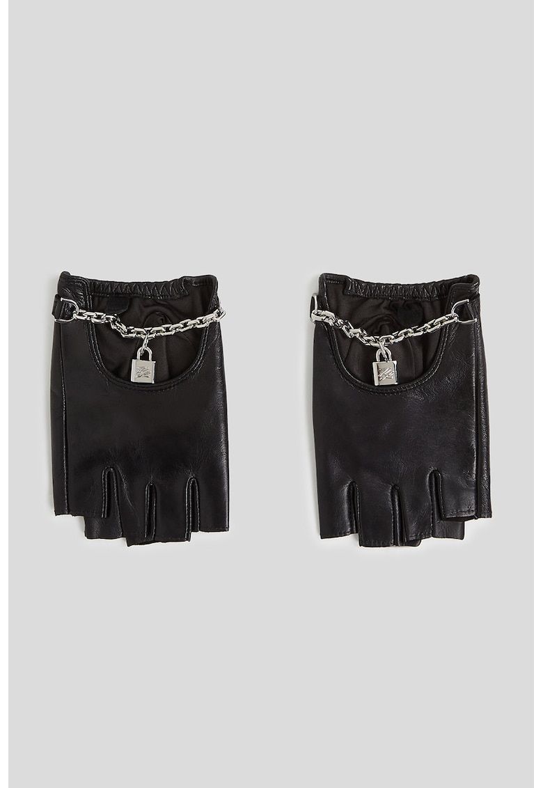 Caracteristici Culoare: negru Imprimeu: uni Detalii: detalii din lant - model fara degete Material: textil - piele naturala Compozitie Exterior: 60% piele de capra - 37% poliester - 3% spandex