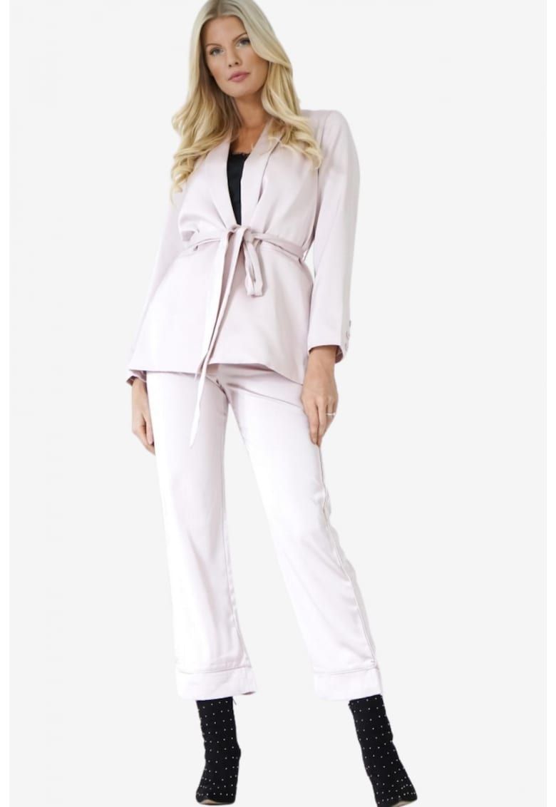 Caracteristici Culoare: roz somon Material: poliester Croiala: dreapta Detalii: talie 75 cm - lungimea exterioara a cracului 97 cm Buzunare: fara buzanare Sistem inchidere: fermoar