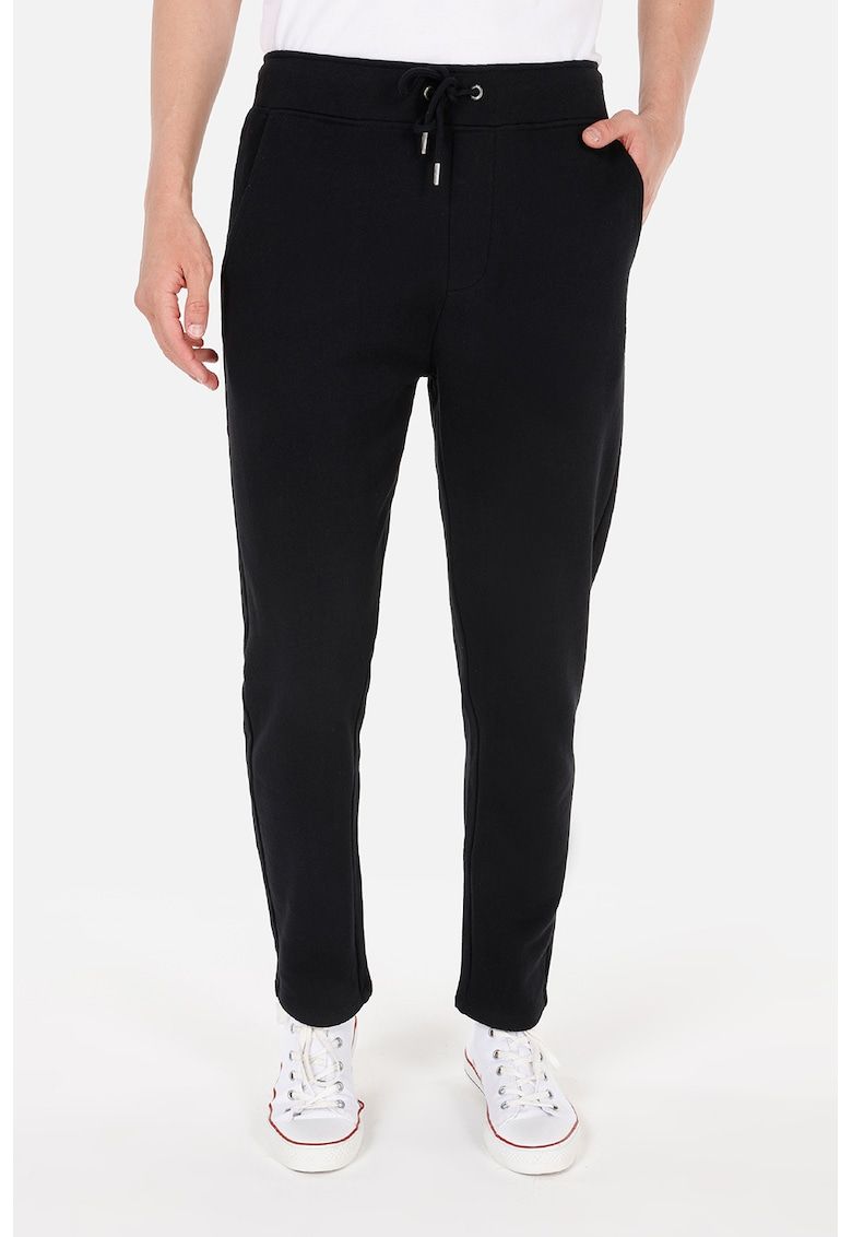 Caracteristici Culoare: negru Imprimeu: uni Material: bumbac Stil: casual Croiala: conica Talie: medie Buzunare: 2 oblice - unul aplicat Lungime: lungi Detalii: snur pentru ajustare in talie Sistem inchidere: fara inchidere Compozitie Exterior: 100% bumbac