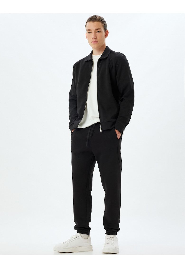 Caracteristici Culoare: negru Imprimeu: uni Material: sintetic - bumbac Stil: casual Croiala: regular fit Talie: medie Buzunare: 2 oblice Lungime: lungi Sistem inchidere: fara inchidere Compozitie Exterior: bumbac - poliester