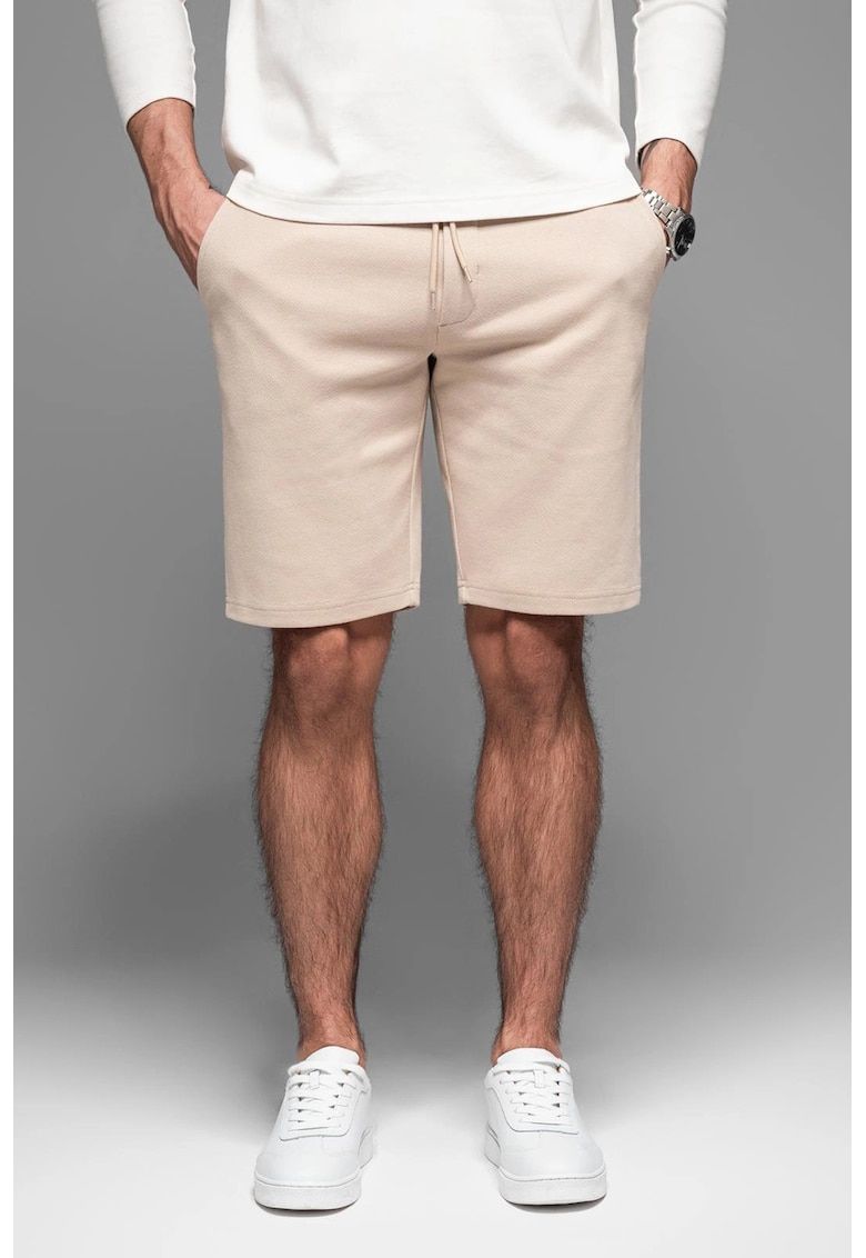 Caracteristici Culoare: maro taupe deschis Imprimeu: uni Material: sintetic - bumbac Stil: casual Croiala: regular fit Talie: medie Buzunare: oblice - cu refilet Lungime: scurti Detalii: snur pentru ajustare in talie Compozitie Exterior: 75% bumbac - 25% poliester