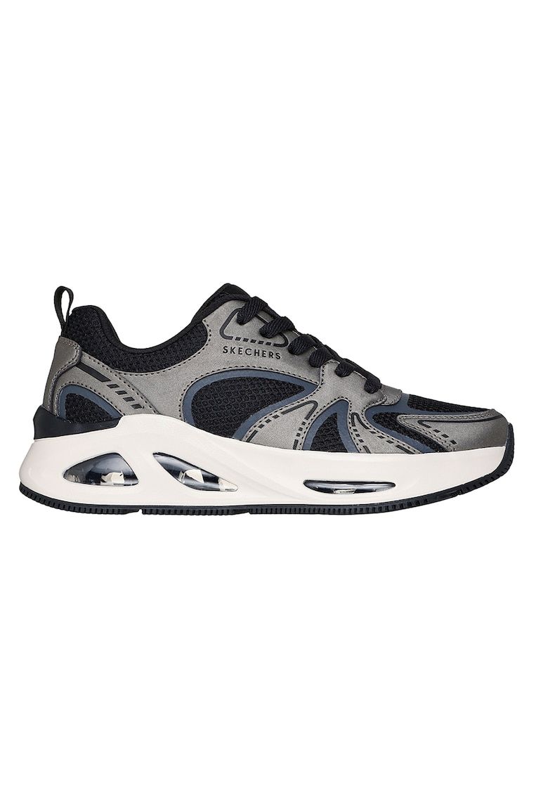 Caracteristici Culoare: negru - gunmetal Varf: rotund Imprimeu: logo Tip talpa: wedge Tehnologie: air-cooled memory foam® Material: textil - piele ecologica Stil: casual Sistem inchidere: siret Linie Brand: skechers street™ Compozitie Partea superioara: alte materiale - material textil Material interior: textil Material talpa: alte materiale
