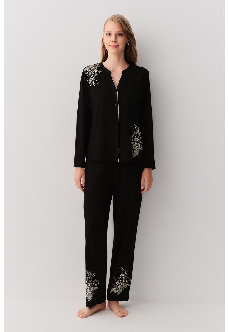 Caracteristici Tip produs: pijama Culoare: negru - alb murdar Material: viscoza Imprimeu: grafic Decolteu: in v Lungime maneca: maneca lunga Lungime pantaloni: lungi Compozitie Exterior: 95% viscoza - 5% elastan