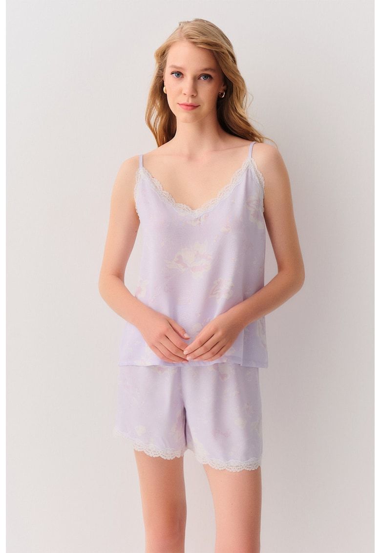 Caracteristici Tip produs: pijama Culoare: liliac prafuit Material: viscoza Imprimeu: floral Decolteu: in v Croiala: regular fit Lungime maneca: fara maneca Lungime pantaloni: scurti Compozitie Exterior: 100% viscoza Material garnituri: 83% poliamida - 17% elastan