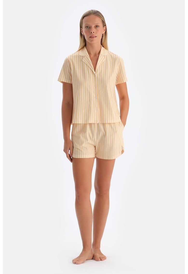Caracteristici Tip produs: pijama Culoare: alb - galben sofran Material: modal Imprimeu: dungi Decolteu: in v Guler: cu revere Croiala: regular fit Lungime maneca: maneca scurta Lungime pantaloni: scurti Buzunare: laterale Sistem inchidere: nasturi Compozitie Exterior: 50% bumbac - 50% modal