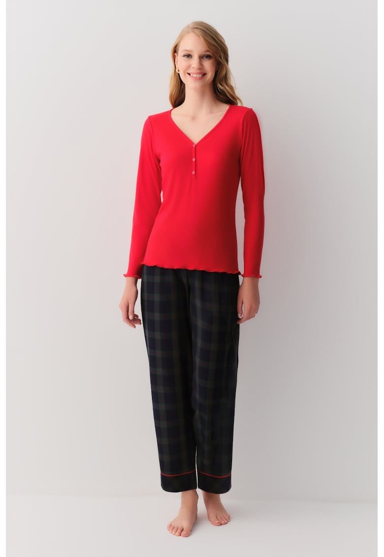 Caracteristici Tip produs: pijama Culoare: rosu - negru Material: poliester - viscoza Imprimeu: carouri - uni Decolteu: in v Croiala: regular fit Lungime maneca: maneca lunga Talie: medie Lungime pantaloni: lungi Sistem inchidere: nasturi Compozitie Exterior: bluza: 63% poliester - 33% viscoza - 4% elastan - pantaloni: 62% viscoza - 38% poliester