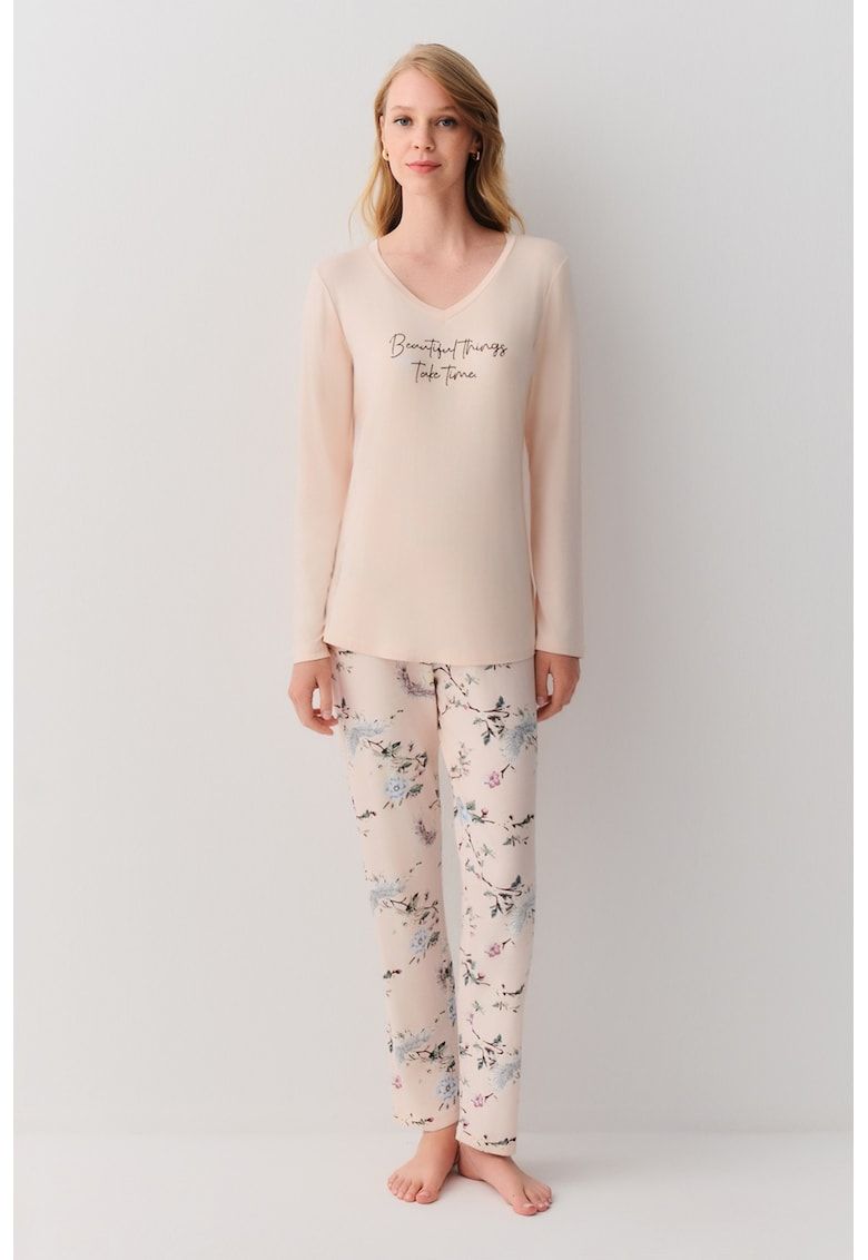 Caracteristici Tip produs: pijama Culoare: roz somon - negru stins Material: viscoza Imprimeu: text - grafic Decolteu: in v Lungime maneca: maneca lunga Lungime pantaloni: lungi Compozitie Exterior: 95% viscoza - 5% elastan