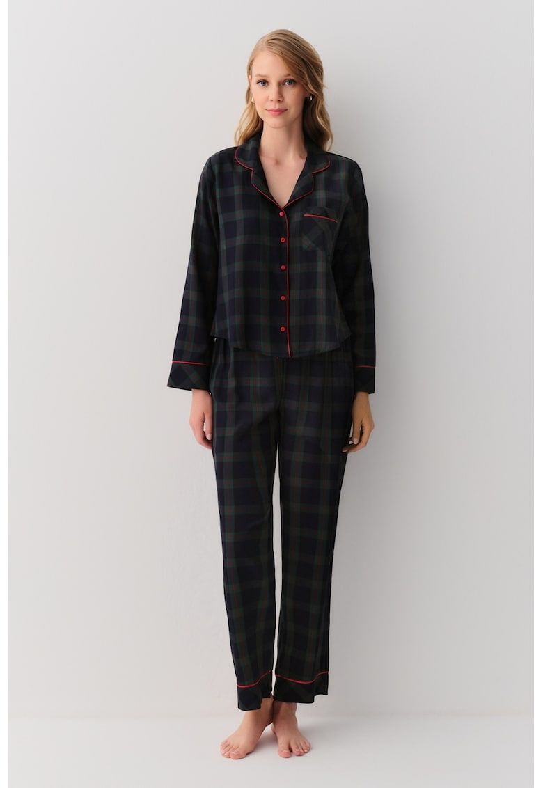 pijama lunga cu model in carouri si revere decupate