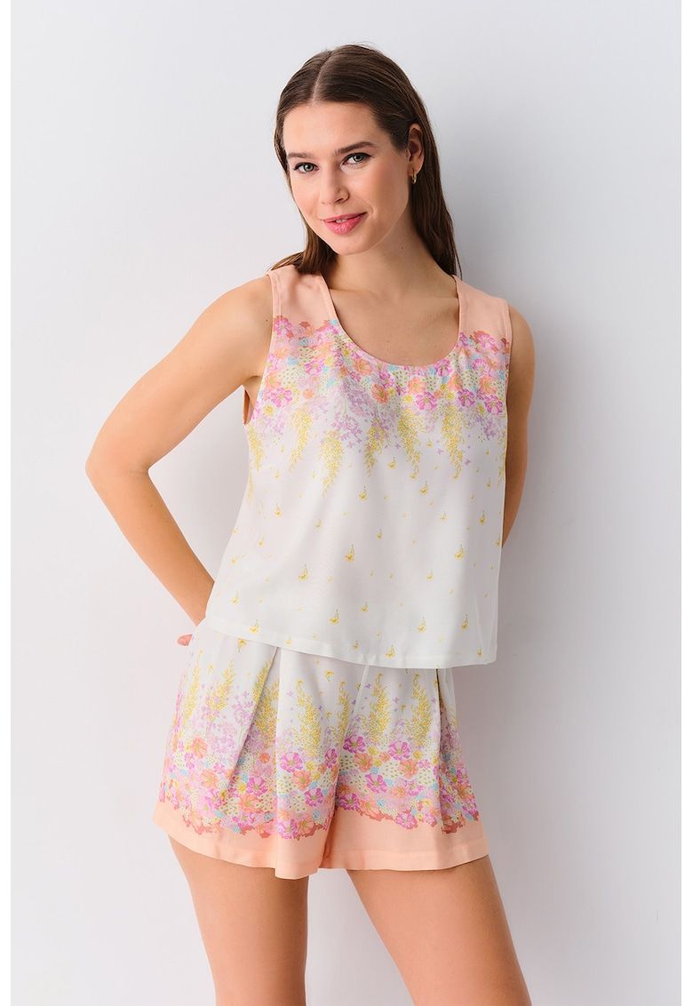Caracteristici Tip produs: pijama Culoare: portocaliu mandarina - lila - alb murdar Material: viscoza Imprimeu: floral Decolteu: rotund Lungime maneca: fara maneca Lungime pantaloni: scurti Compozitie Exterior: 100% viscoza