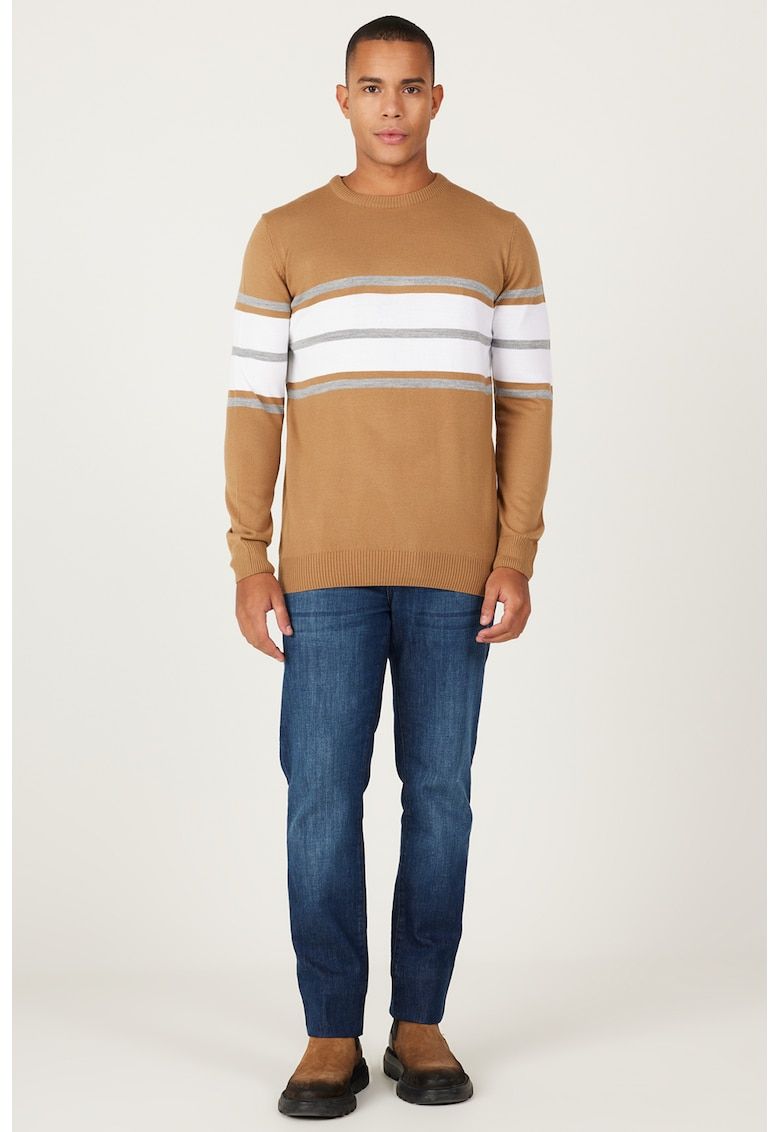 Caracteristici Culoare: alb - bej Imprimeu: dungi Material: acril Croiala: regular fit Sistem inchidere: fara inchidere Model: rotund Lungime maneca: maneca lunga Compozitie Exterior: 100% acrilic