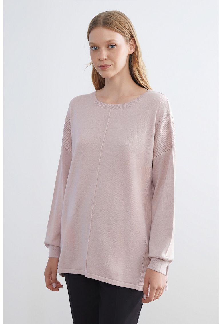 Caracteristici Tip produs: pulover Culoare: roz pal Imprimeu: uni Material: bumbac - acril Model: rotund Croiala: lejer Sistem inchidere: fara inchidere Lungime maneca: maneca lunga Tip maneca: ampla Compozitie Exterior: 50% acrilic - 50% bumbac